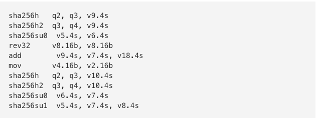 作为minio / sha256-simd存储库的一部分,我们添加了arm64 Golang汇编版本,其摘录如下所示(仅一个循环,即多个循环):