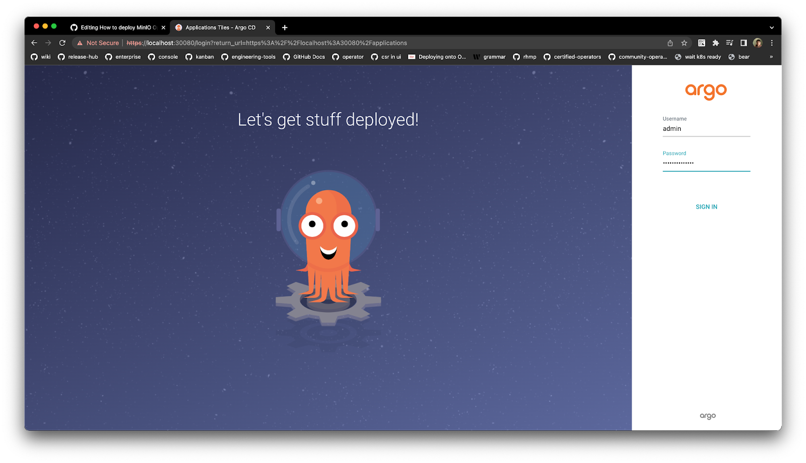$ argocd login localhost: 30080 WARNING: server certificate had error: tls: failed to verify certificate: x509: certificate signed by unknown authority. Proceed insecurely (y/n)? y Username: admin Password: 'admin:login' logged in successfully Context 'localhost:30080' updated
