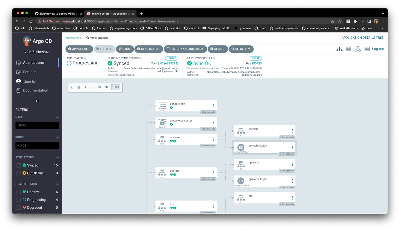 让我们同步 minio-tenant app并等待它部署,然后公开控制台服务并使用 UI 访问它