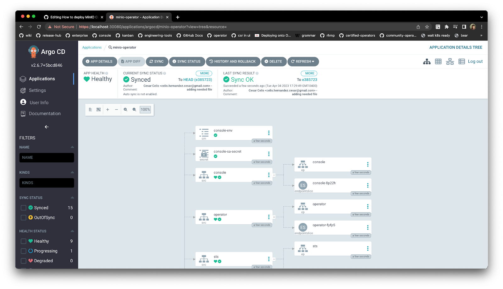 $ kubectl create namespace minio-operator namespace/minio-operator created $ argocd app create minio-operator --repo https: //github.com/cniackz/minio-argocd.git --path minio-operator --dest-namespace minio-operator --dest-server https://kubernetes.default.svc --insecure --upsert application 'minio-operator' created