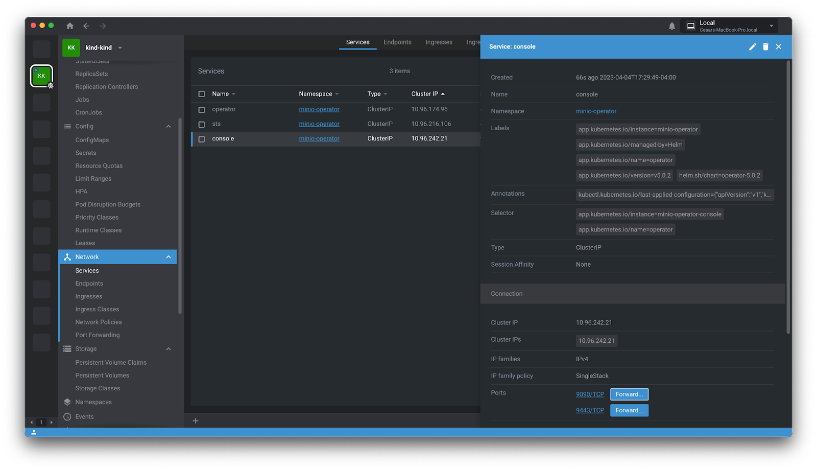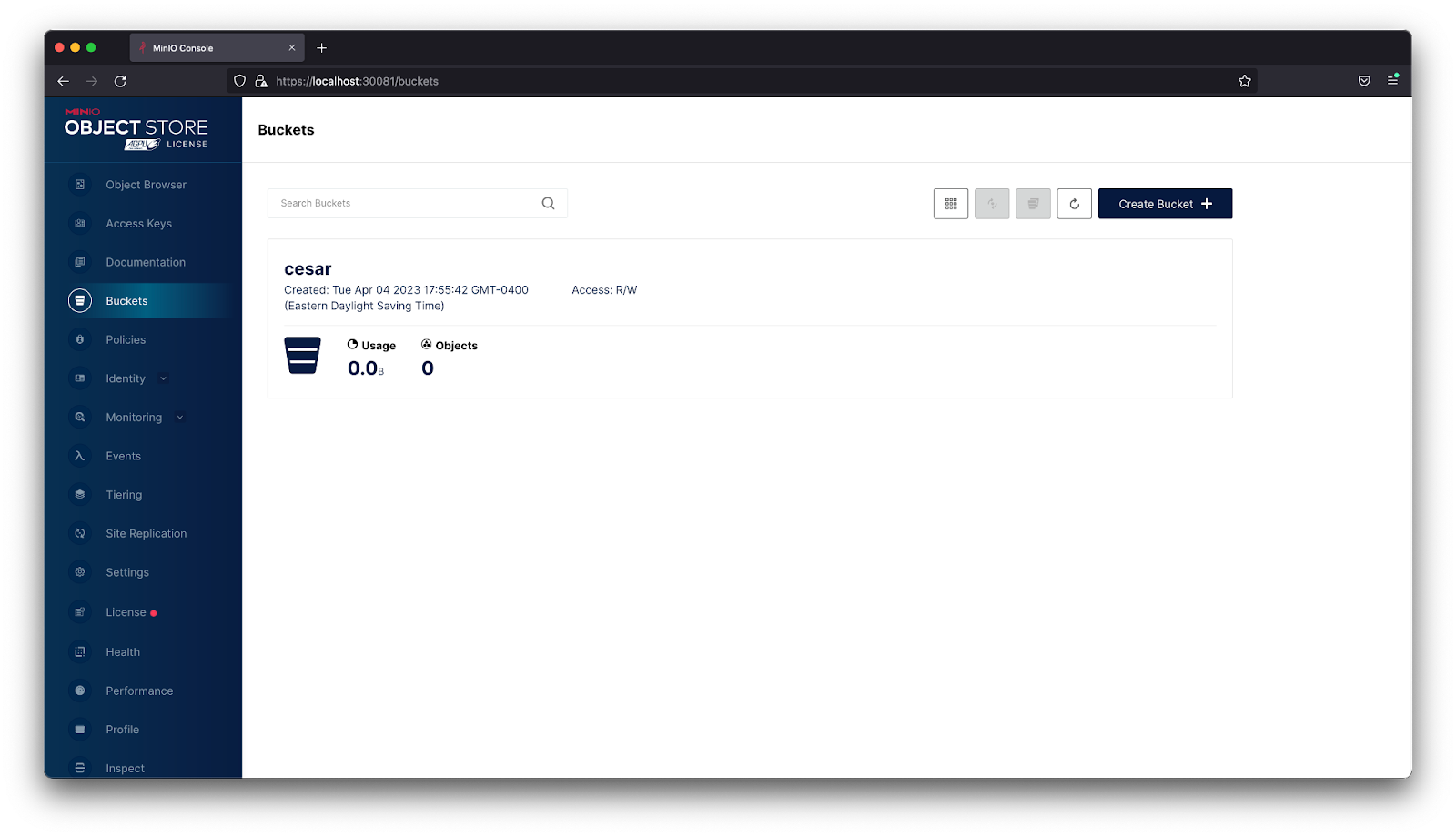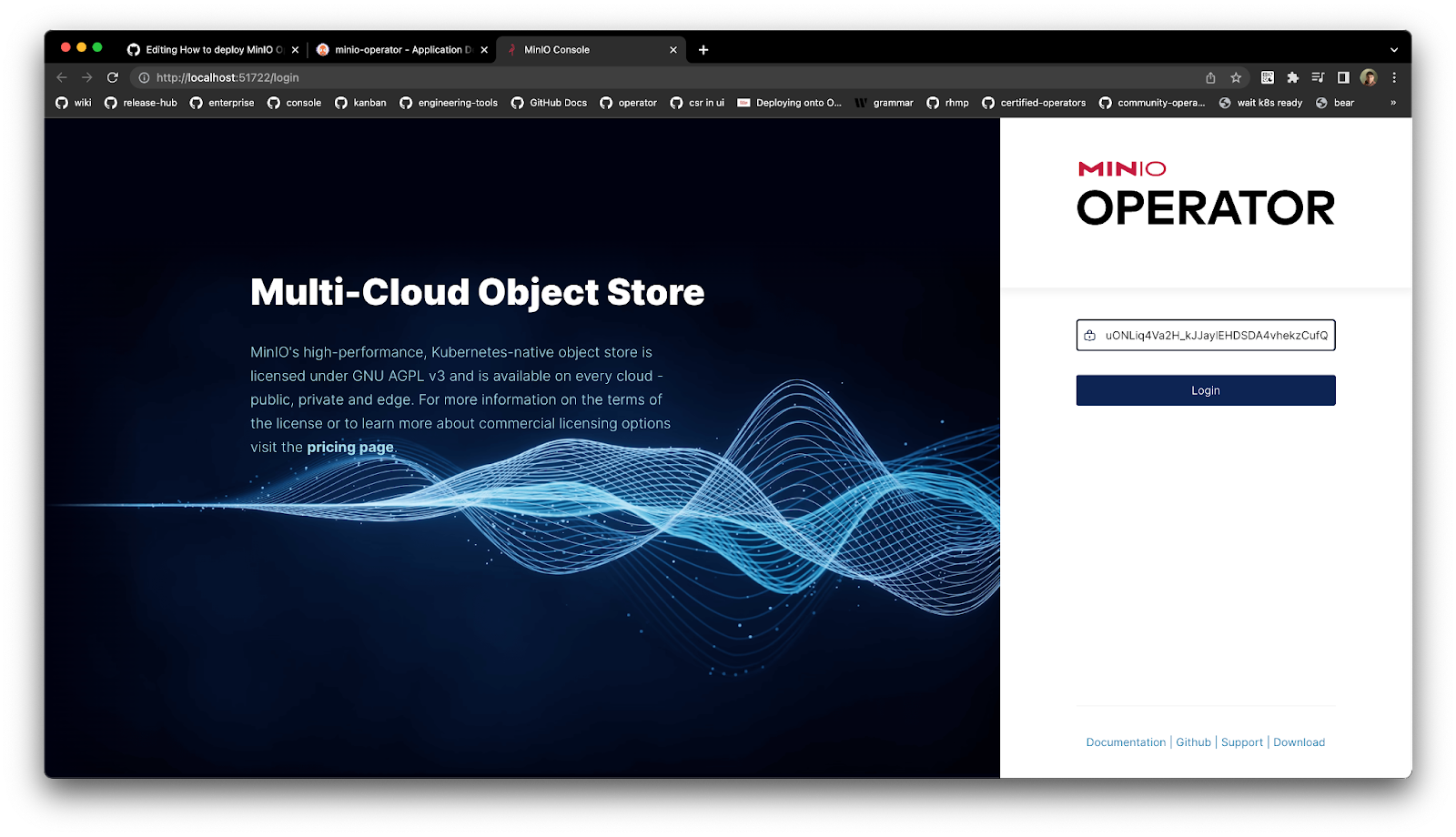将 MinIO Operator 控制台公开为 NodePort,以便可以访问它,确保在我们之前使用的 Kind 集群配置中打开此端口。 要登录到 MinIO 操作员控制台,请使用 URL http://localhost:/login