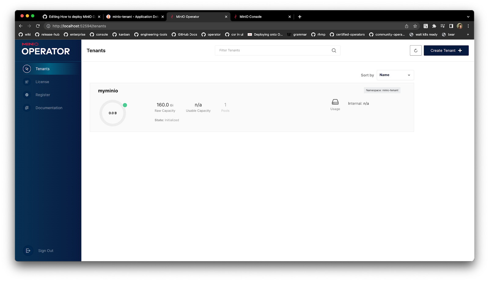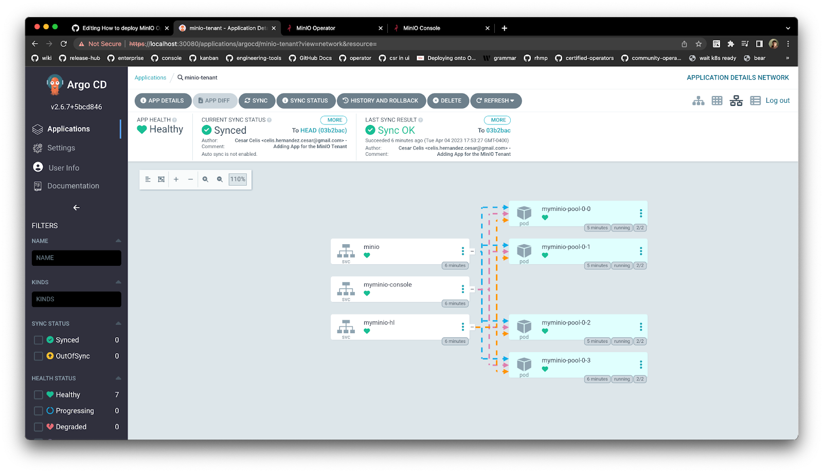 $ kubectl create namespace minio-tenant namespace/minio-tenant created Cesars-MacBook-Pro:minio-argocd cniackz$ argocd app create minio-tenant \ > --repo https: //github.com/cniackz/minio-argocd.git \ > --path minio-tenant \ > --dest-namespace minio-tenant \ > --dest-server https: //kubernetes.default.svc \ > --insecure \ > --upsert application 'minio-tenant' created