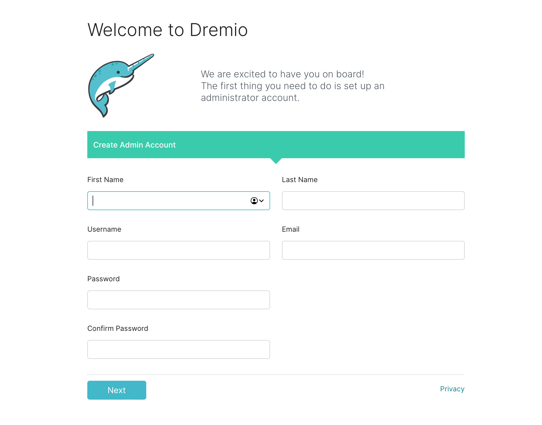 要登录 Dremio,让我们dremio-client为本地主机的服务打开一个端口转发。执行以下命令后,将浏览器指向http://localhost:9047。为了安全起见,请记得在探索完 Dremio 后关闭端口转发。