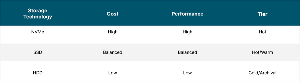 由于这里的主要用例是存储,所以让我们从谈论驱动器开始。有许多不同类型的驱动器,每种驱动器在成本、性能和容量方面都有很大差异;必须根据用例进行选择。驱动大致可以分为以下三类: