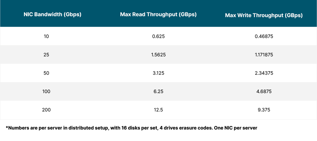 在谈论网络性能时,您需要考虑几件事。由于某些开销,尤其是在考虑分布式设置时,实际上不可能达到 NIC 的最大理论速度。除了 MinIO 之外,还有其他网络服务在其正常操作期间使用带宽。因此,您可以预期大约 50% 的 NIC 容量可用于 MinIO。在未来的博客文章中,我们将详细介绍网络的内部结构以及为 MinIO 设置网络的最佳方式。