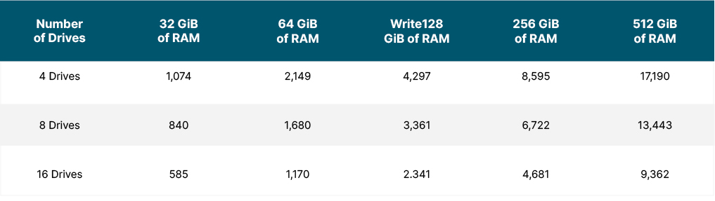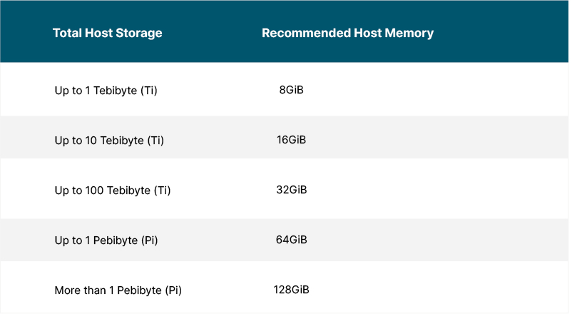 一般来说,内存量取决于请求数和集群中的驱动器数。下表显示了存储量和推荐的最小内存。