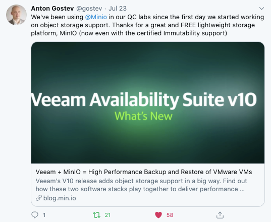 Veeam:备份是大生意,Veeam是领导者。他们对S3端点有巨大的推动力。这是因为他们在聆听350,000个客户方面表现出众,这些客户都希望对象存储具有传奇般的可伸缩性和弹性。尽管“记录在案”,但Veeam并没有受到喜爱-事实是他们在内部使用我们并且是忠实的粉丝。MinIO是他们的最爱之一: